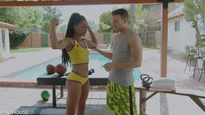 Kira Noir пришла на тренировку, чтобы научиться играть в баскетбол, но забыла о мечте, когда заметила стояк тренера. Пацан быстро поддался соблазну и стал кайфовать от минета в исполнении черной красотки, а после предварительных ласк оттарабанил ее в пилотку, меняя позы, и слил кончу на подтянутую попку.